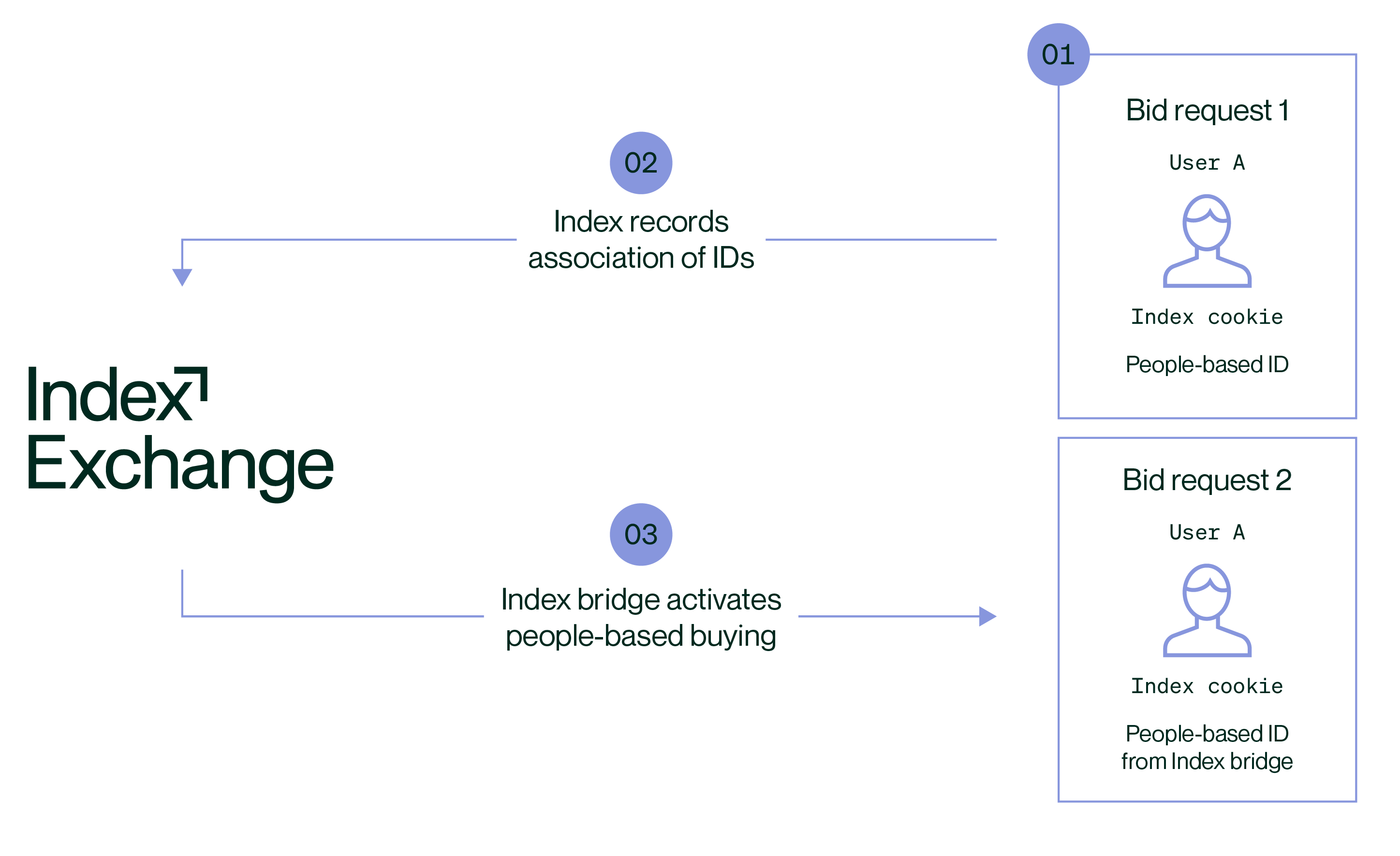 - When Index sees the original Index cookie identifier in future bid requests, Index can enrich them with people-based identifiers and products, such as IX Matched Audience campaigns.