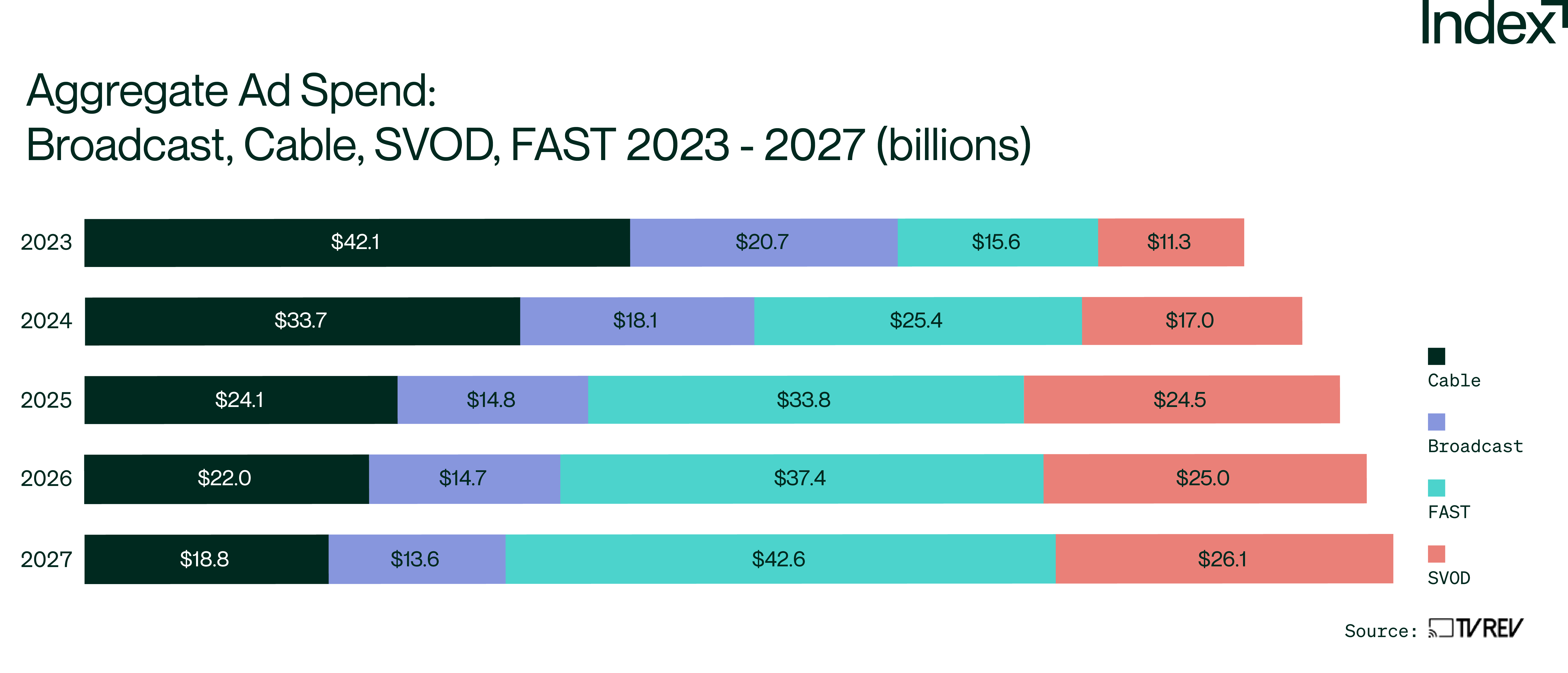 With a well-established (and still growing) viewership, marketers are taking note of the opportunity in FAST. A report from TVREV expects ad spend on FAST services will reach nearly $34 billion by 2025, surpassing that of cable, broadcast, or subscription video-on-demand (SVOD) services.