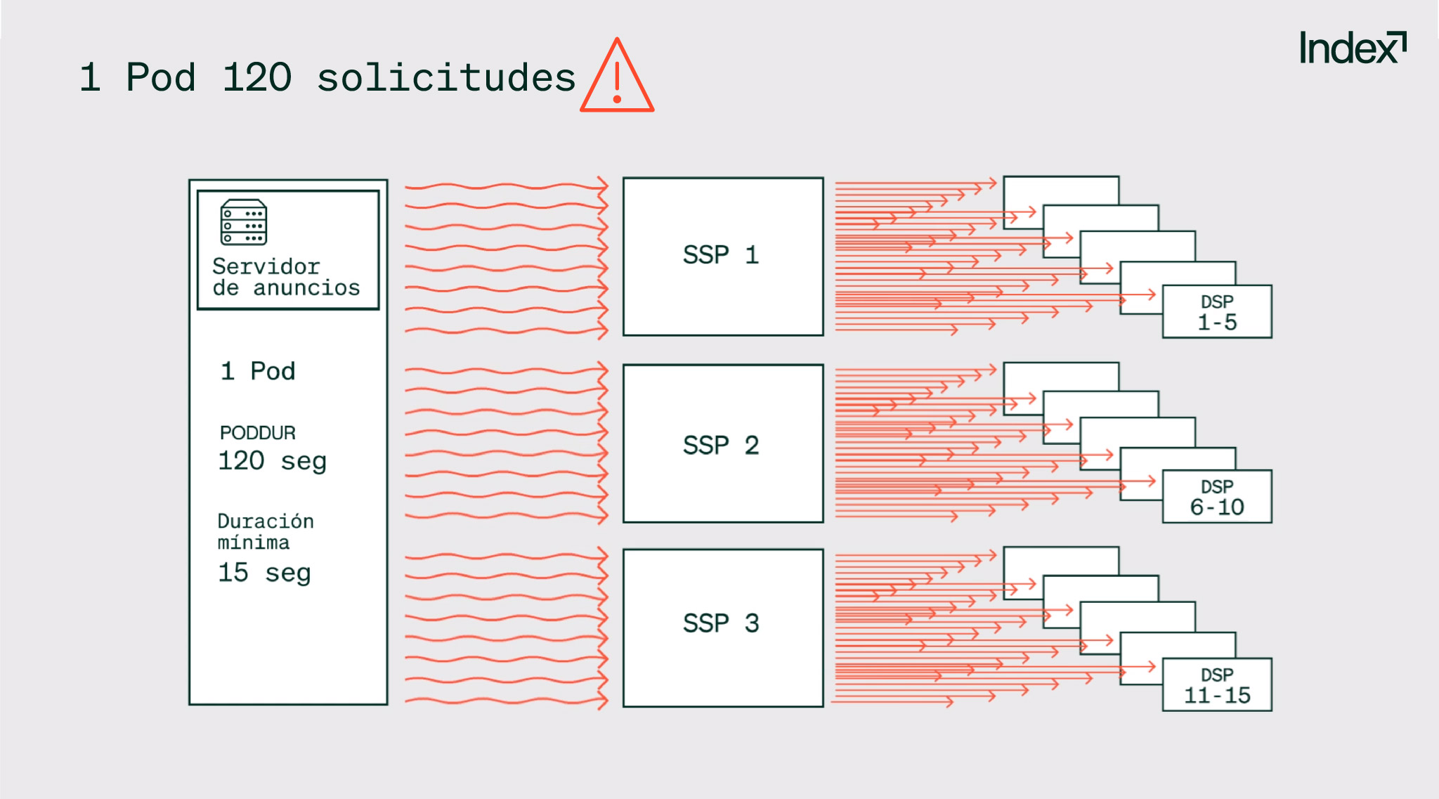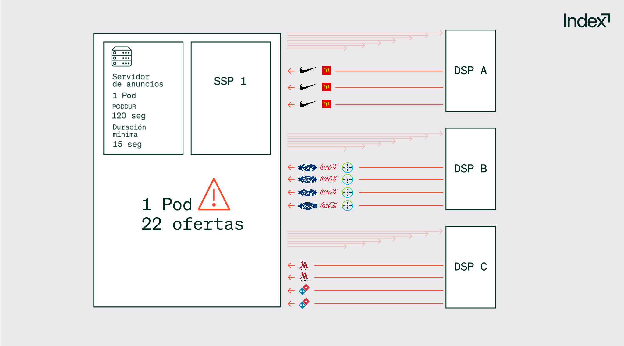 1. La SSP que recibe estas pujas de las DSP tampoco tiene ni idea de que las ocho bid requests originales corresponden a un único ad pod. Esto quiere decir que ahora agregará y subastará las bid requests de forma independiente.