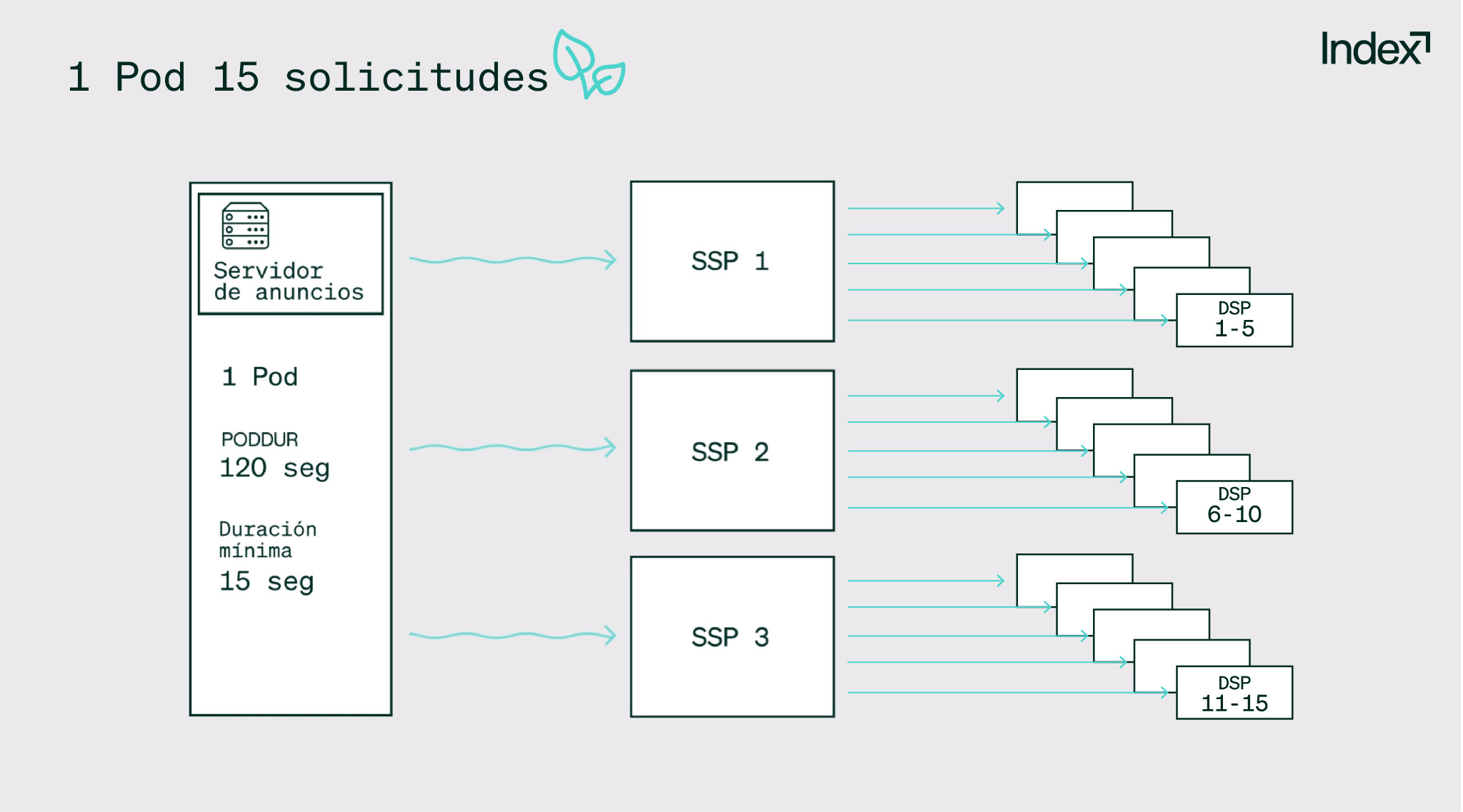 1. Las tres SSP a su vez envían una sola solicitud con ad podding a sus tres DSP socias. Ahora vemos que solo se crean 15 bid requests para una única pausa publicitaria de un solo espectador.