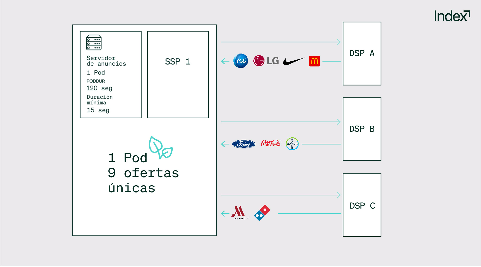 En una situación en la que todas las partes del proceso ofrecen compatibilidad con OpenRTB 2.6 y ad podding, cada DSP recibiría una solicitud de ad pod que incluiría todas las oportunidades publicitarias, y así la DSP podría pujar en consecuencia.