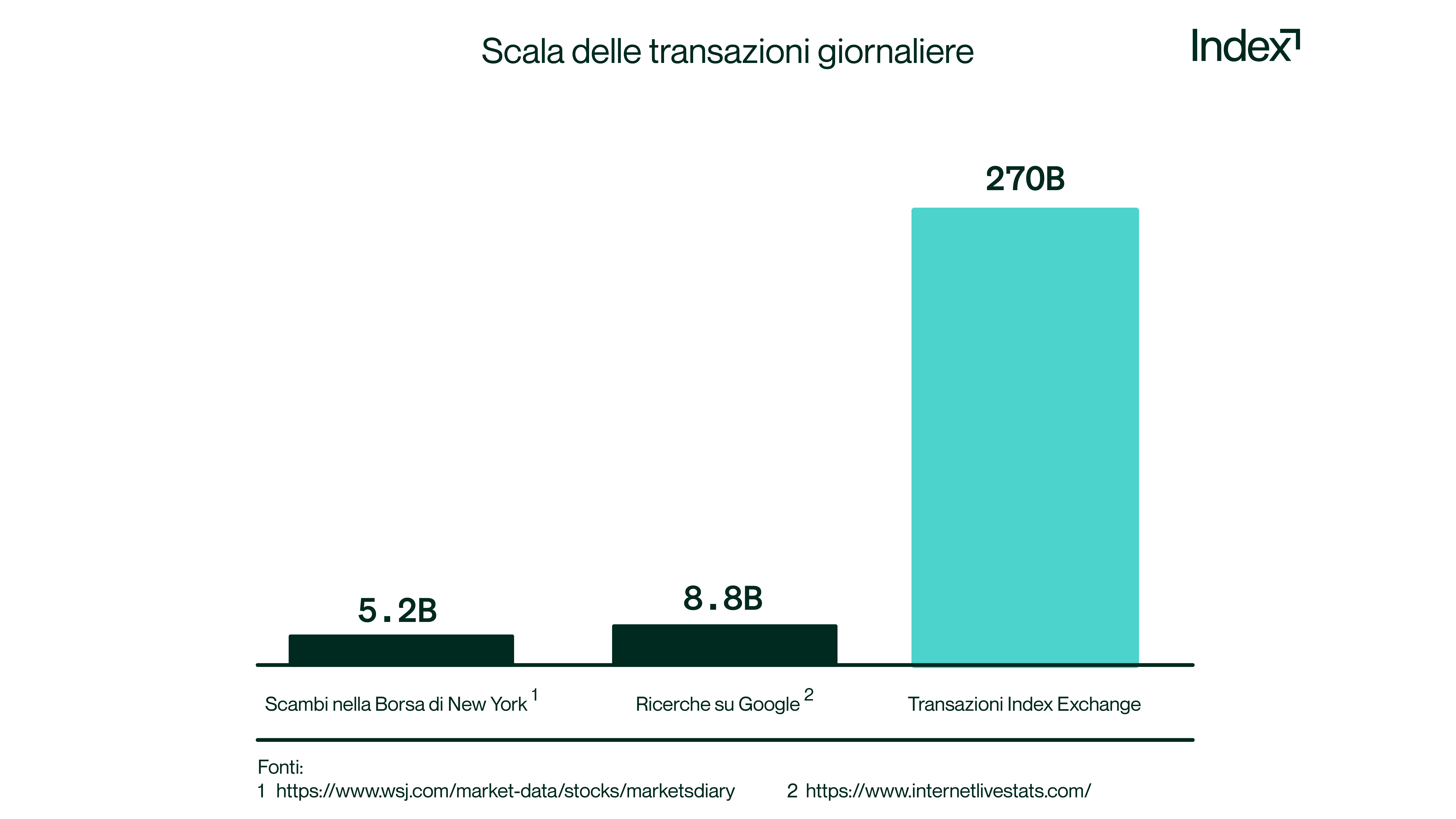Il numero di transazioni giornaliere in scambi programmatici ha superato da tempo il numero di transazioni in mercati finanziari come la Borsa di New York. Solamente In Index Exchange infatti elaboriamo più di 270 miliardi di transazioni al giorno. Tuttavia, il processo di determinazione del prezzo e la trasparenza dei dati sui prezzi sono ancora assenti nel programmatic advertising.