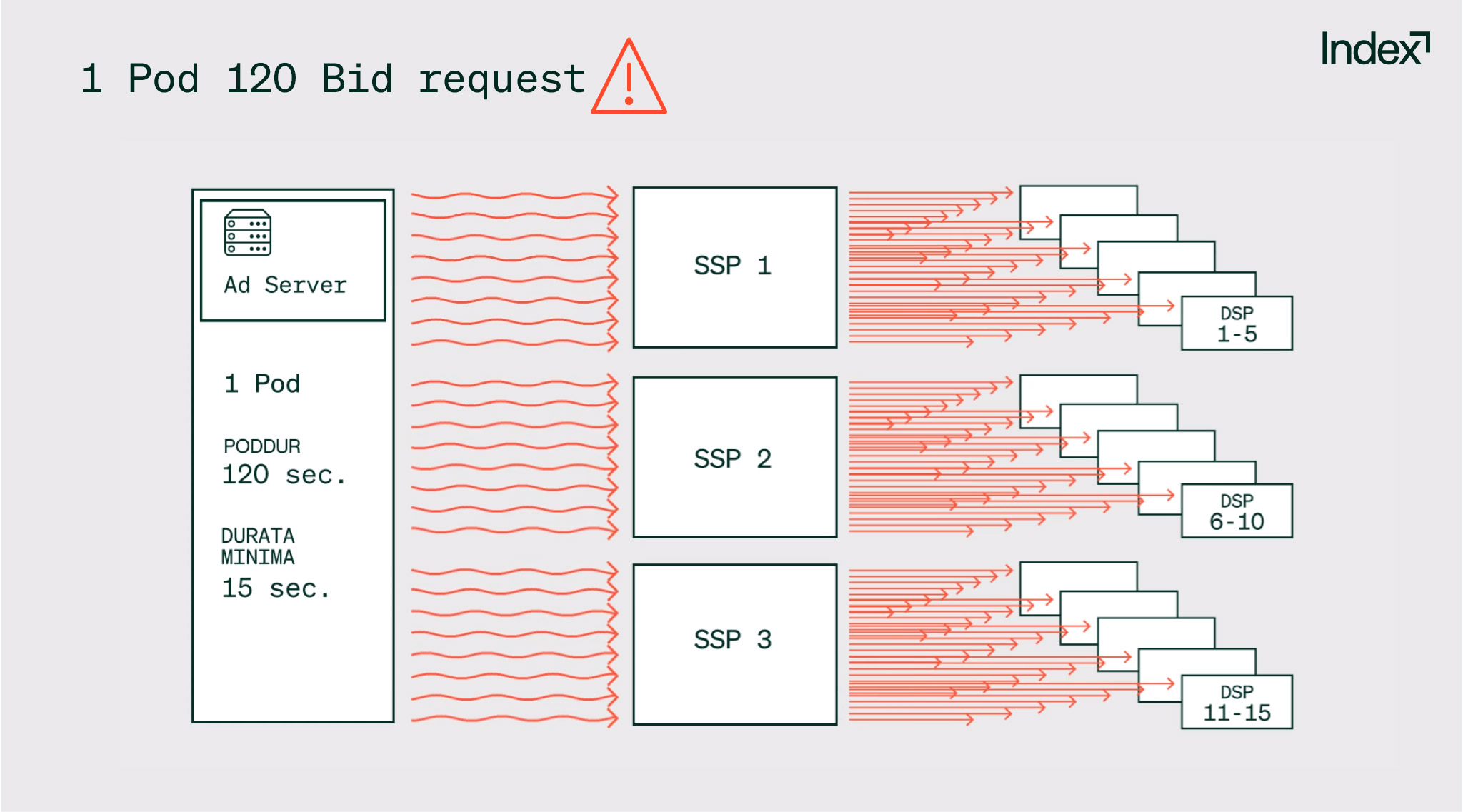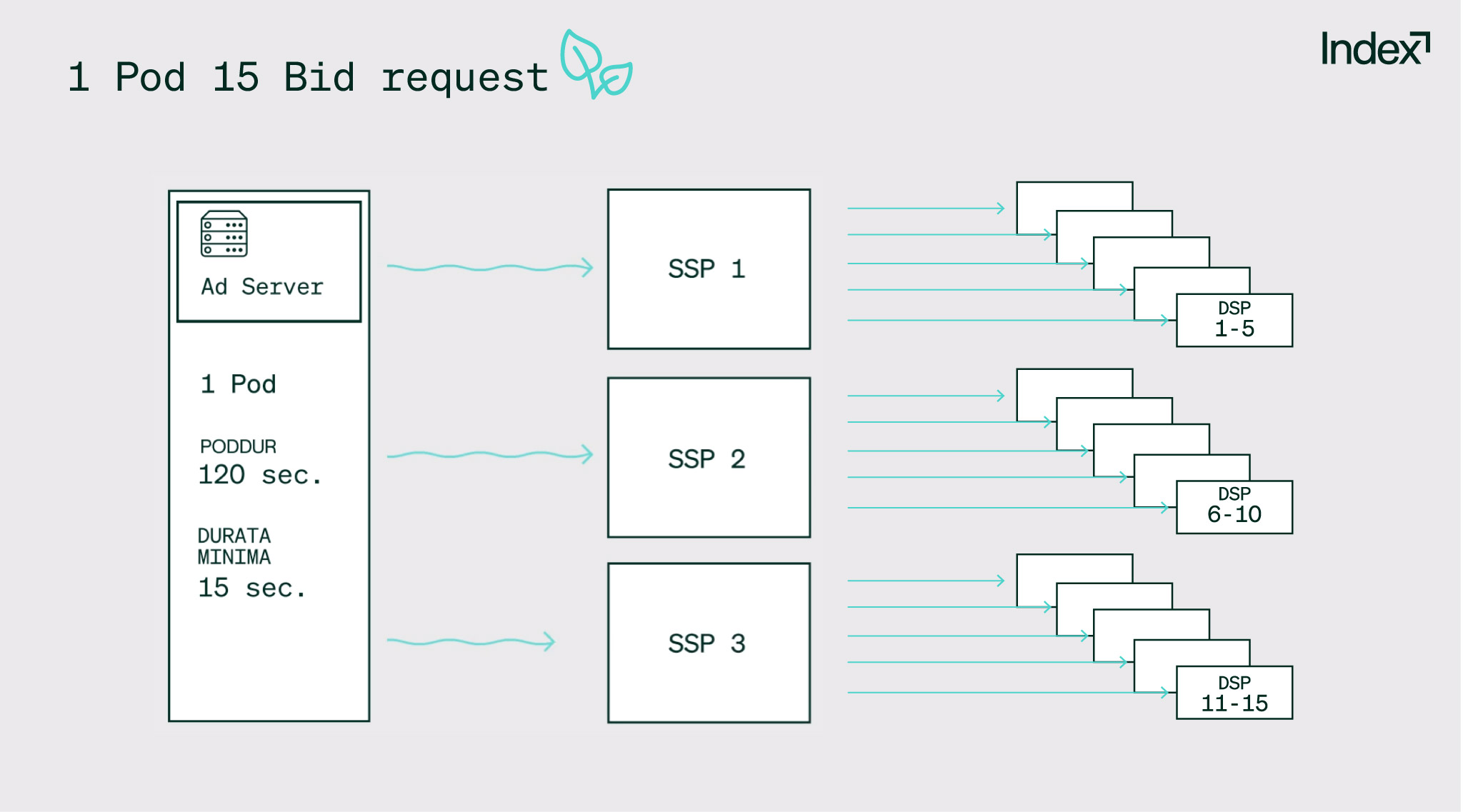 - Le tre SSP inviano a loro volta un’unica richiesta di podding alle loro cinque partner DSP. Ora abbiamo solo 15 bid request prodotte da quell’unica interruzione pubblicitaria per un singolo spettatore.