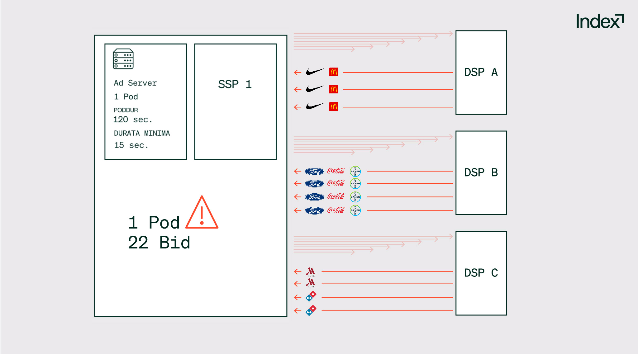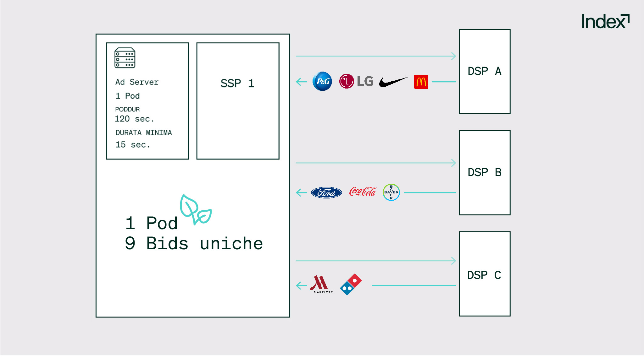 In questo caso, la DSP A restituirebbe le bid per McDonald’s e Nike una sola volta, e potrebbe aggiungere anche le bid per P&G e LG per lo stesso pod. La DSP B restituirebbe le bid per Bayer, Coca Cola e Ford senza alcuna duplicazione, e la DSP C restituirebbe le bid per Marriott e Domino’s solo una volta.